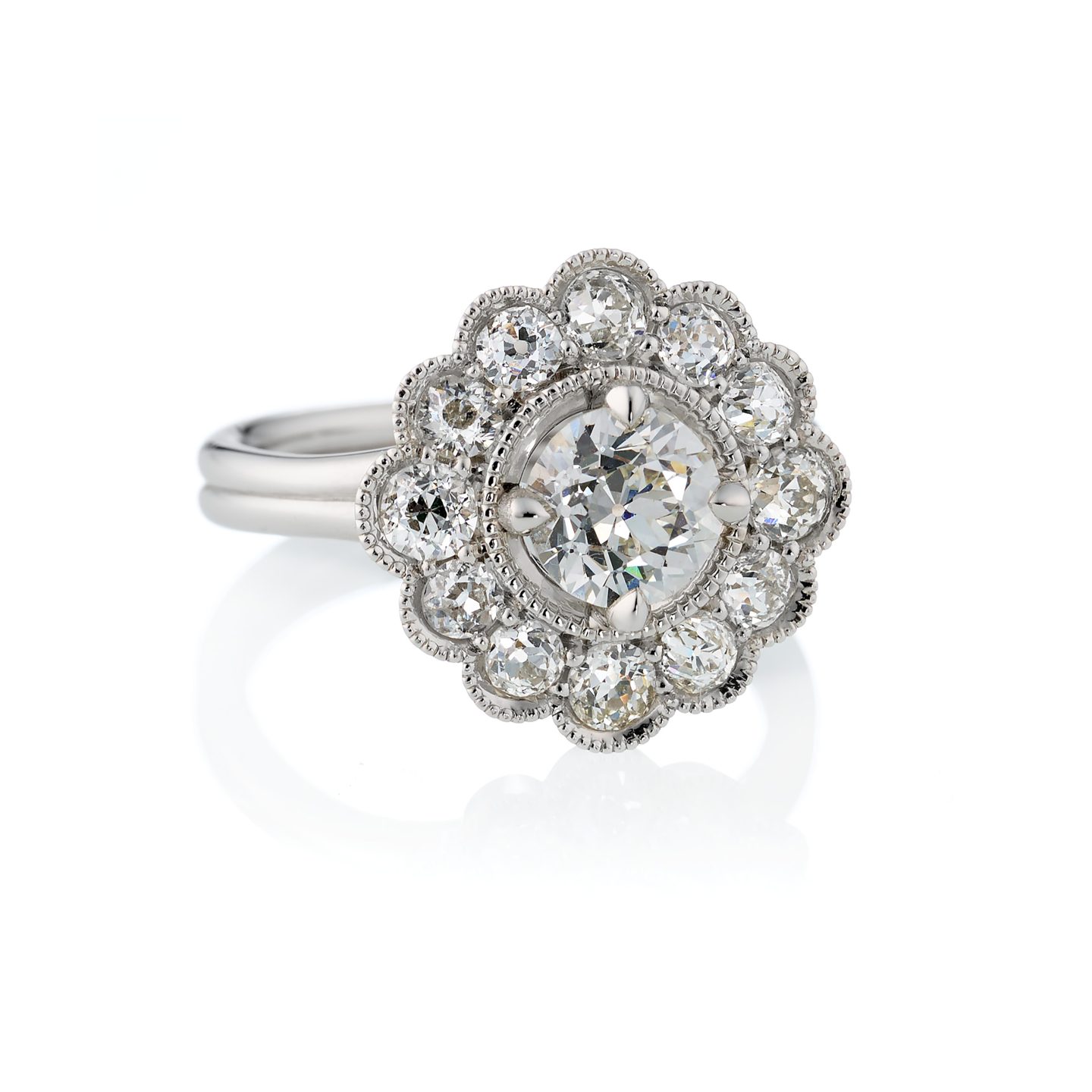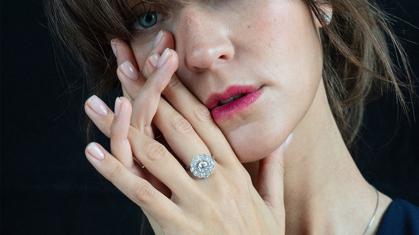 Tässä sormuksessa kimaltelee yli sata vuotta sitten hiotut antiikkitimantit. Timanttien viisteet on hiottu toistamaan parhaiten lämmintä valoa, ajalta ennen sähkövaloja. Antiikkitimanttien hiojilta on vaadittu tarkkaa matemaattista silmää ja rohkeutta lohkaista timantti juuri oikeassa kulmassa, jotta lopputulos on mahdollisimman täydellinen. Timanteille on suunniteltu uudet istutukset ja sormusrunko Helsingissä sijaitsevalla verstaallamme. Sormuksen hinta on 19.550€. Sovitettavissa Kapteeninkadun myymälässä.