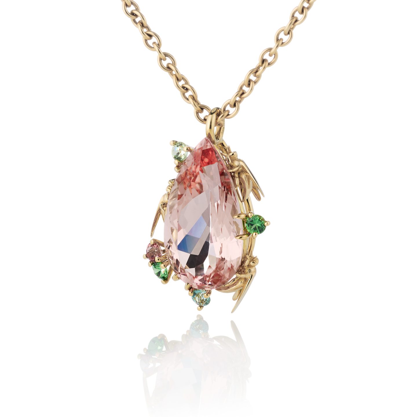 Näyttävän kokoista morganiittia kiertävät kultaiset mehiläiset, tsavoriitit ja turmaliinit. Koru on osa Kulmalan hyönteiskorukokoelmaa, joka suunniteltiin myymälän 20-vuotisjuhlan kunniaksi. Riipuksen hinta ilman ketjua 13.500€.