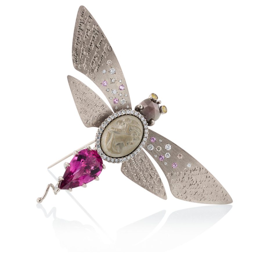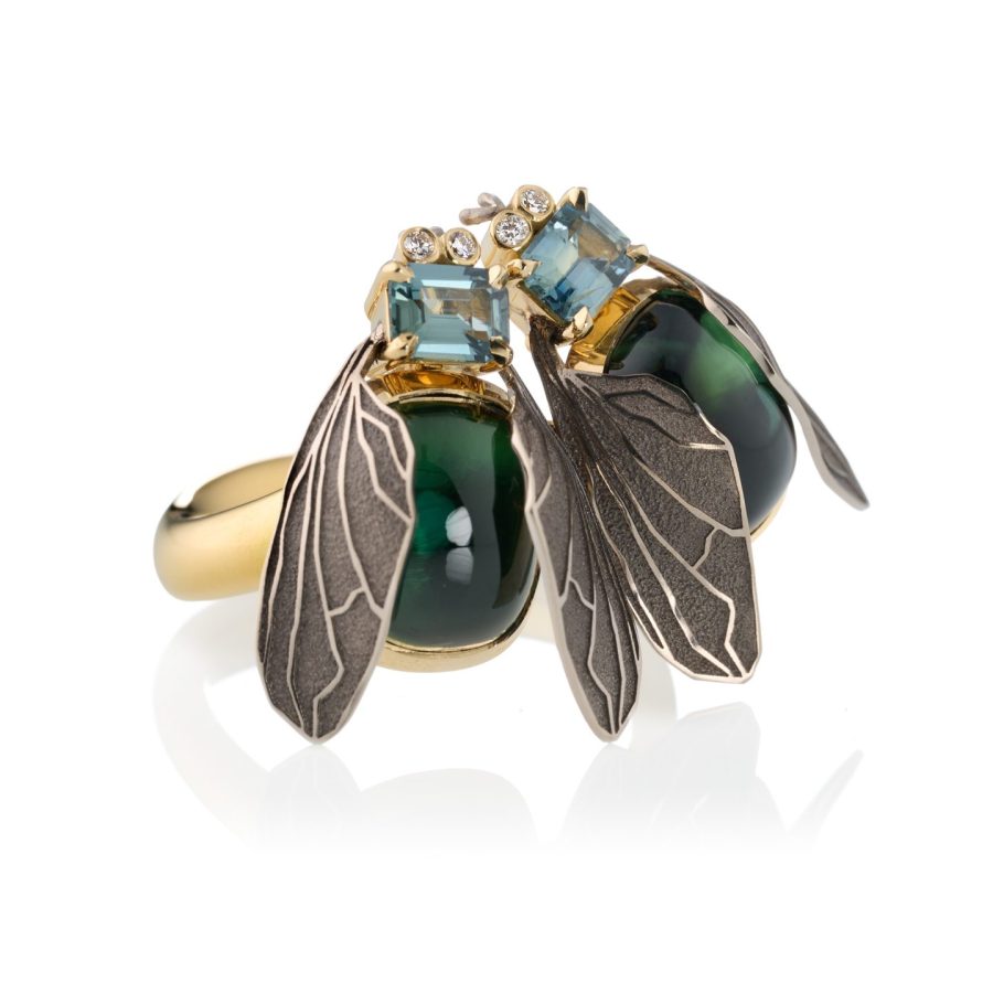 Jalokivet ovat kuin luotuja toistamaan hyönteismaailman sävyjä. Jalokivien kova kiilto ja viimeistellyt hionnat tuovat esiin hyönteisille tunnusomaisia pintoja ja värejä. Kulta ja platina korostavat kauniilla ja harkituilla elementeillään herkkiä ja linjakkaita muotoja, joita hyönteismaailmassa on loputtomasti. Kultasepän on helppo inspiroitua mikroskooppisen pienistä nivelistä, tuntosarvista, kennoista ja siipien ruodoista